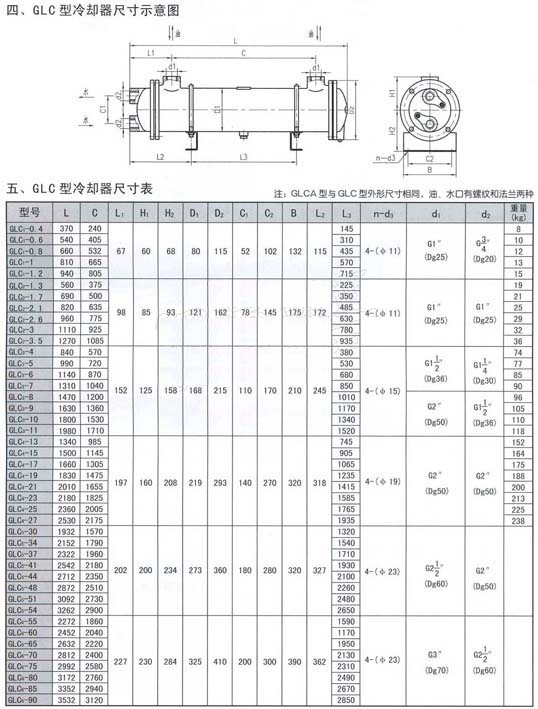 注:GLCA型與GLC型外形尺寸相同,油、水口有螺紋和法蘭兩種冷卻器 |